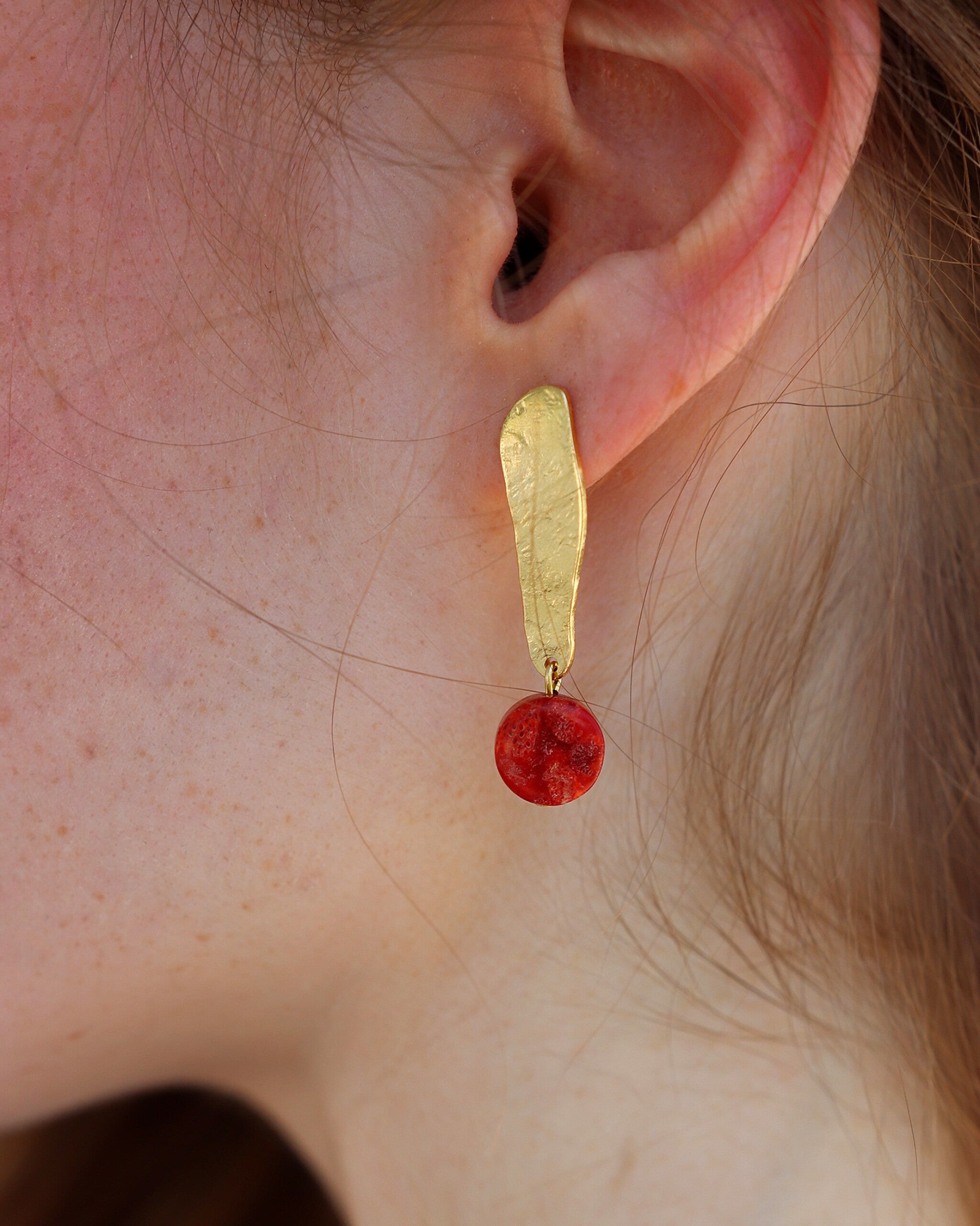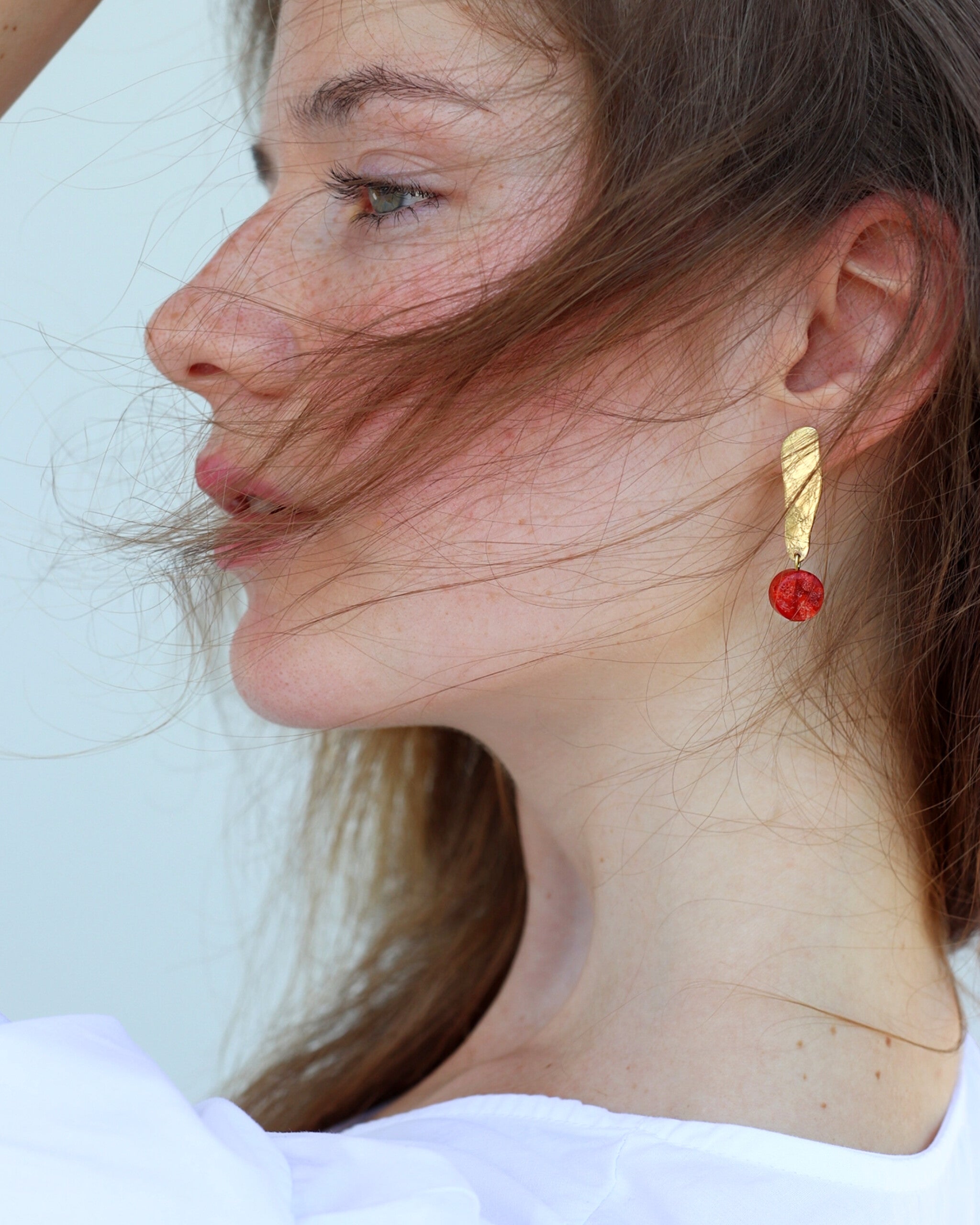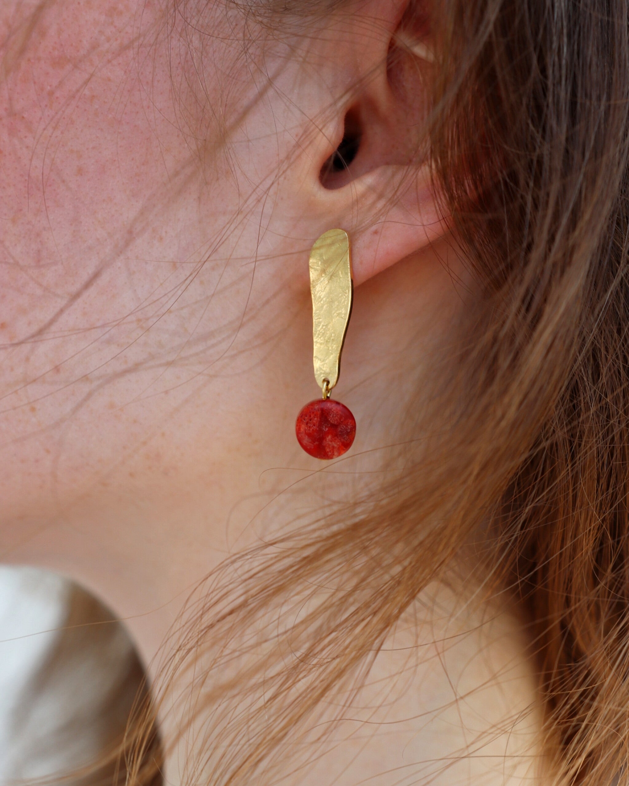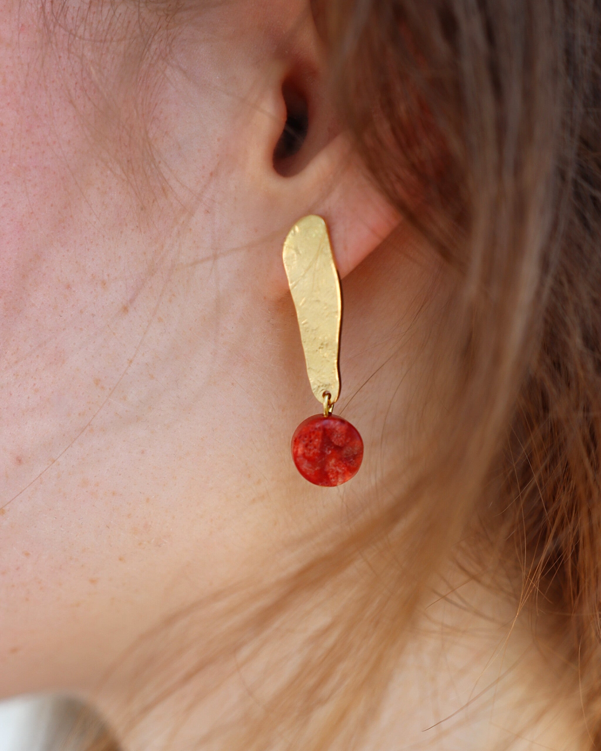 Naušnice koje spajaju toplinu mjedi i ljepotu Mediterana. Ručno teksturirana mjed hvata svjetlost pri svakom pokretu, a crvena koraljna perla donosi dašak ljetnih večeri. Elegantne, ali odvažne — poput muze koja inspirira svojom prisutnošću.