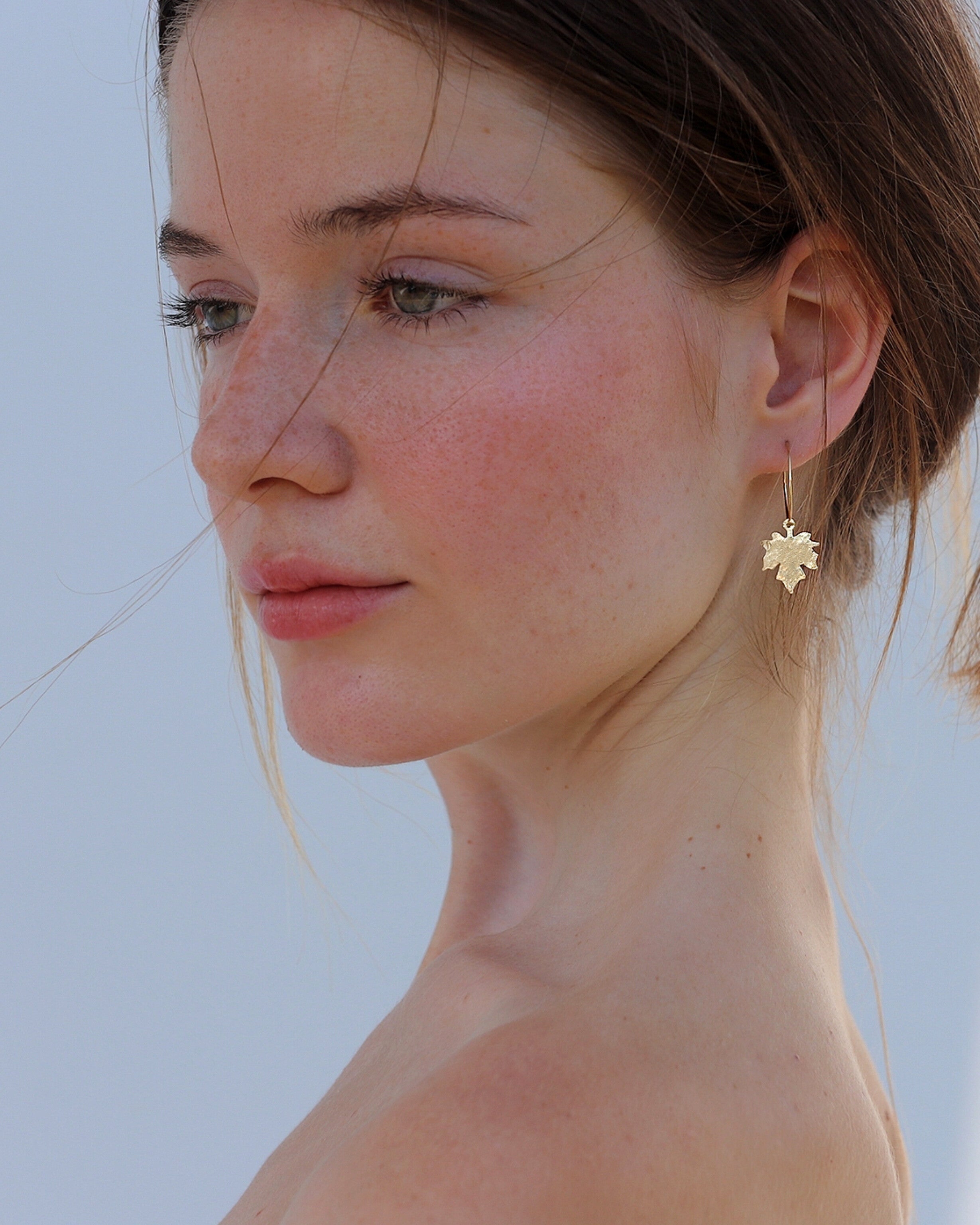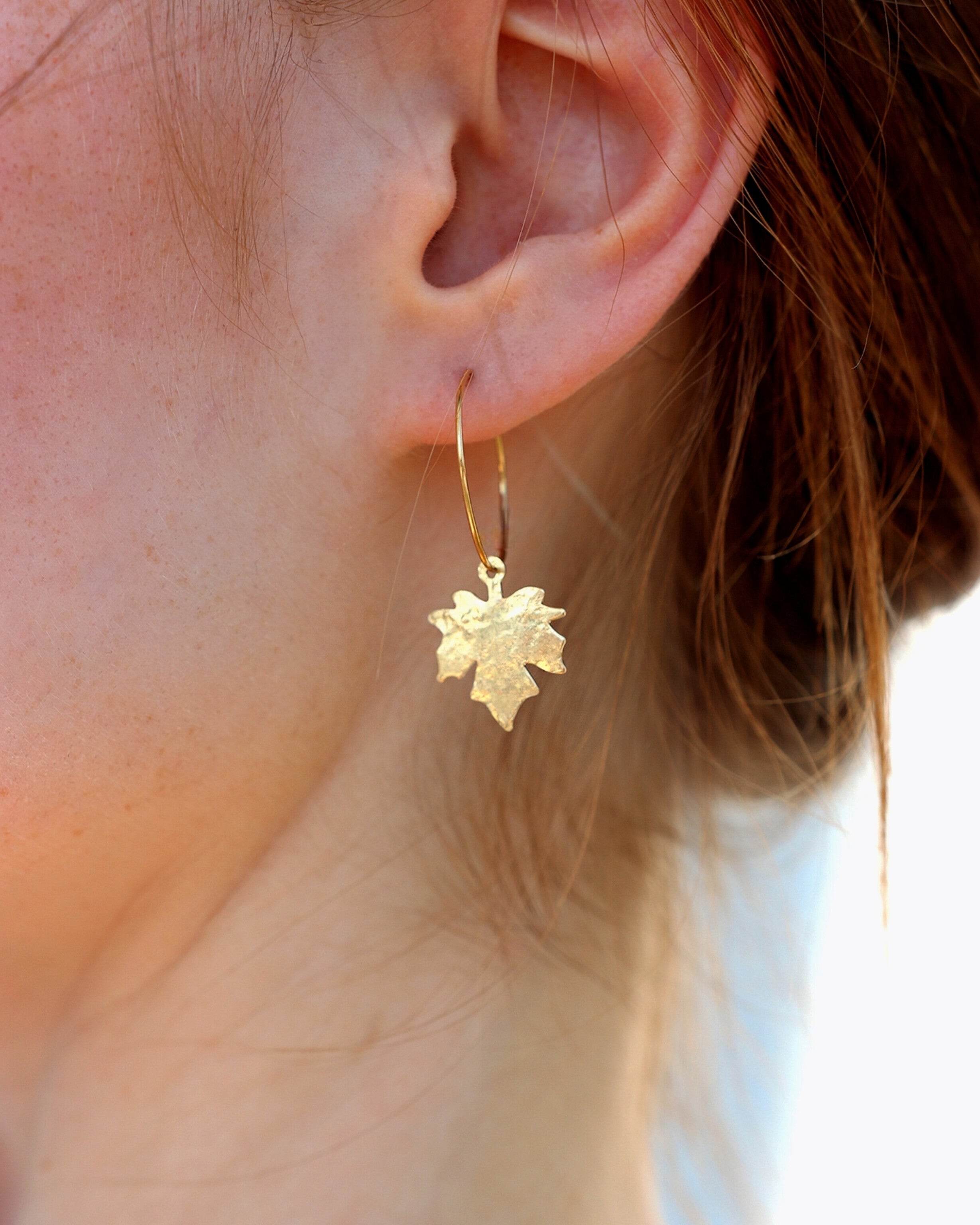 Vrlo lagane ring naušnice s listićima javora od teksturirane mjedi. Svi metalni elementi su od mjedi, uključujući i ring.