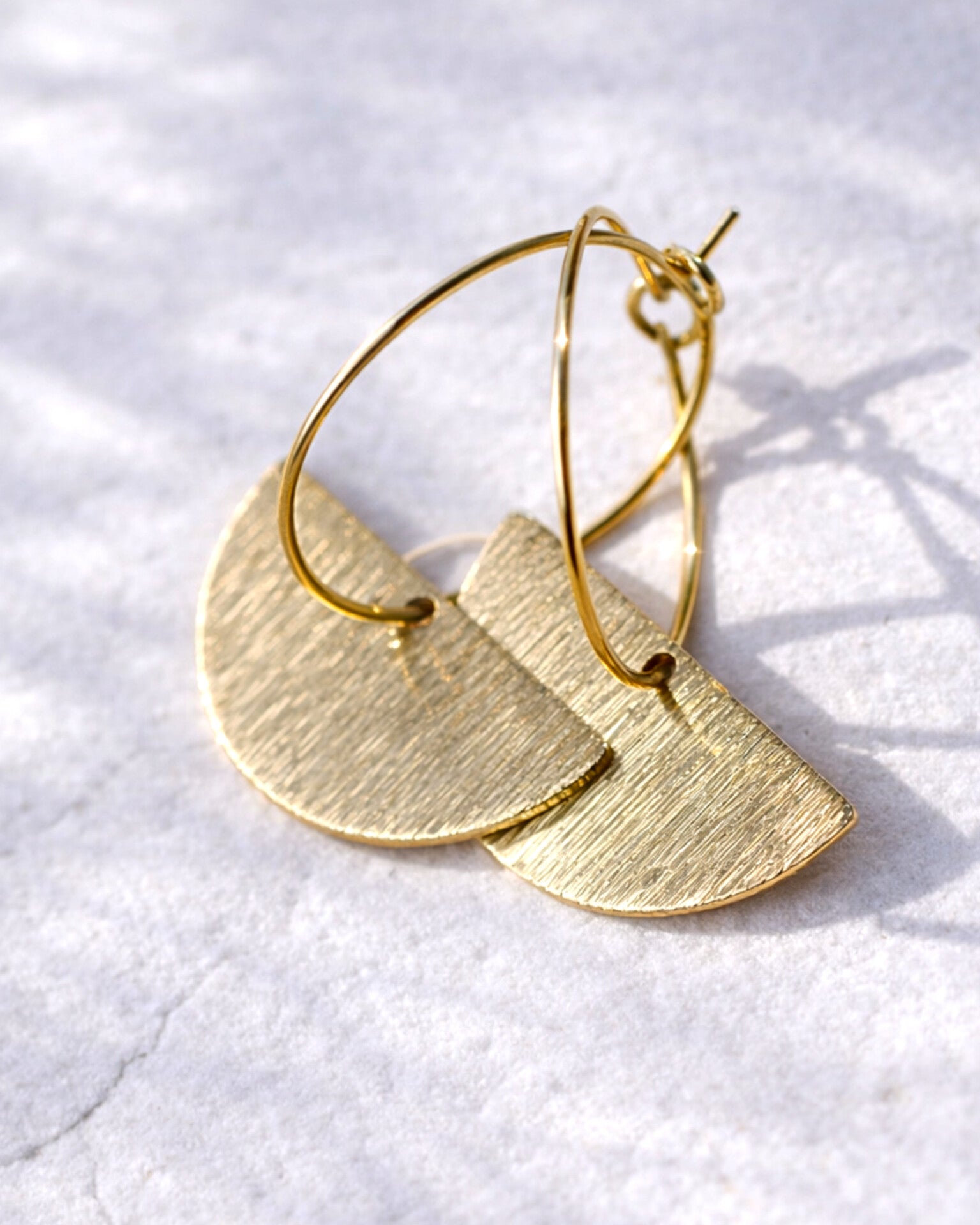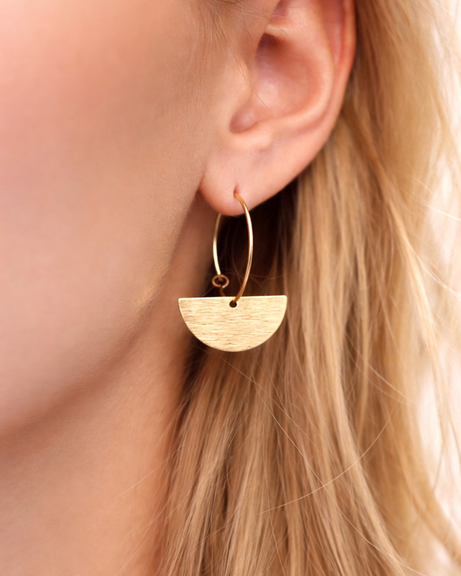 Vrlo lagane i decentne ring naušnice s mjedenim polumjesecom u brushed teksturi. Znatno su manje od CLEO i CLEO MINI naušnica s polumjesecom (usporedite dimenzije). Svi metalni elementi su od mjedi, uključujući i ring.