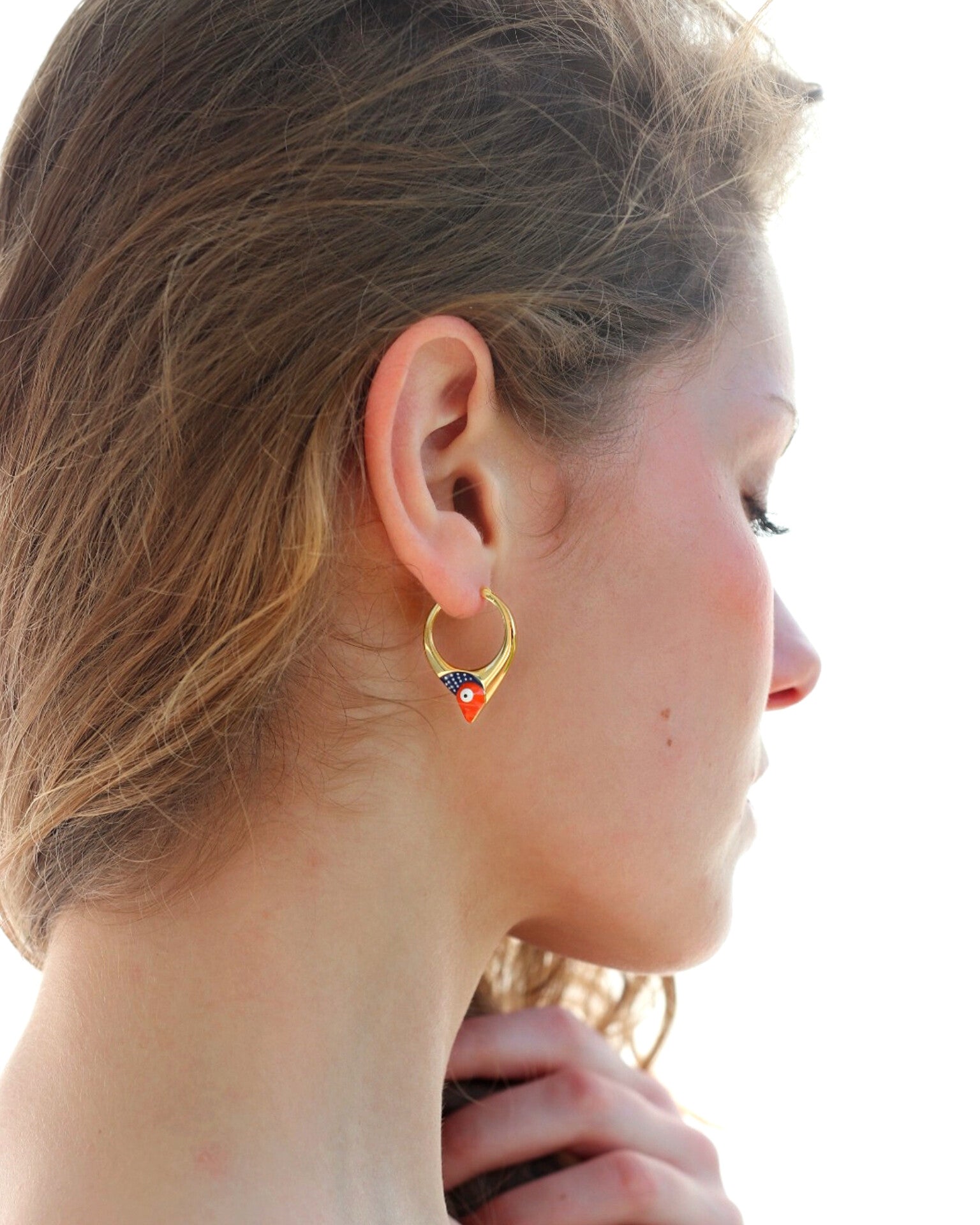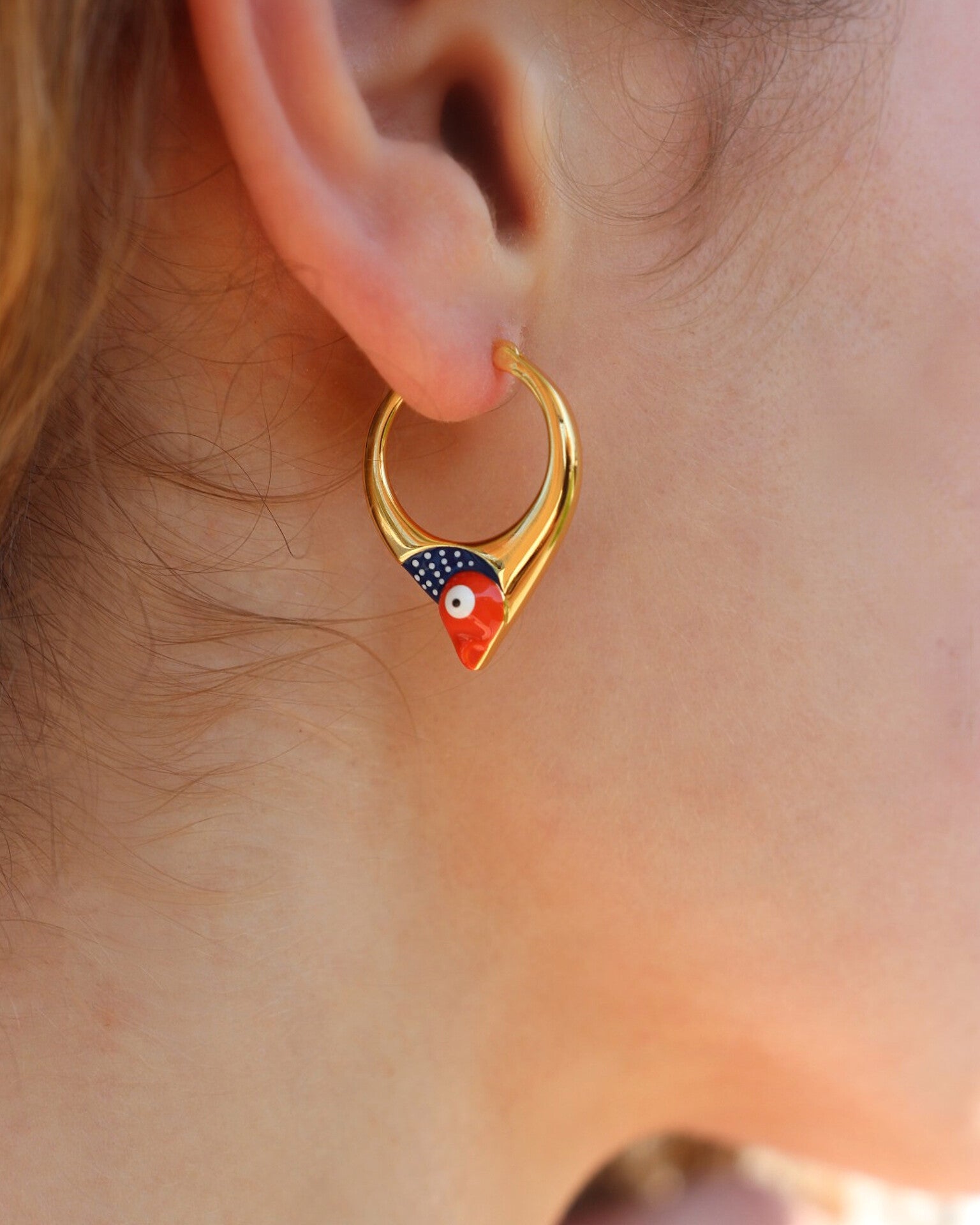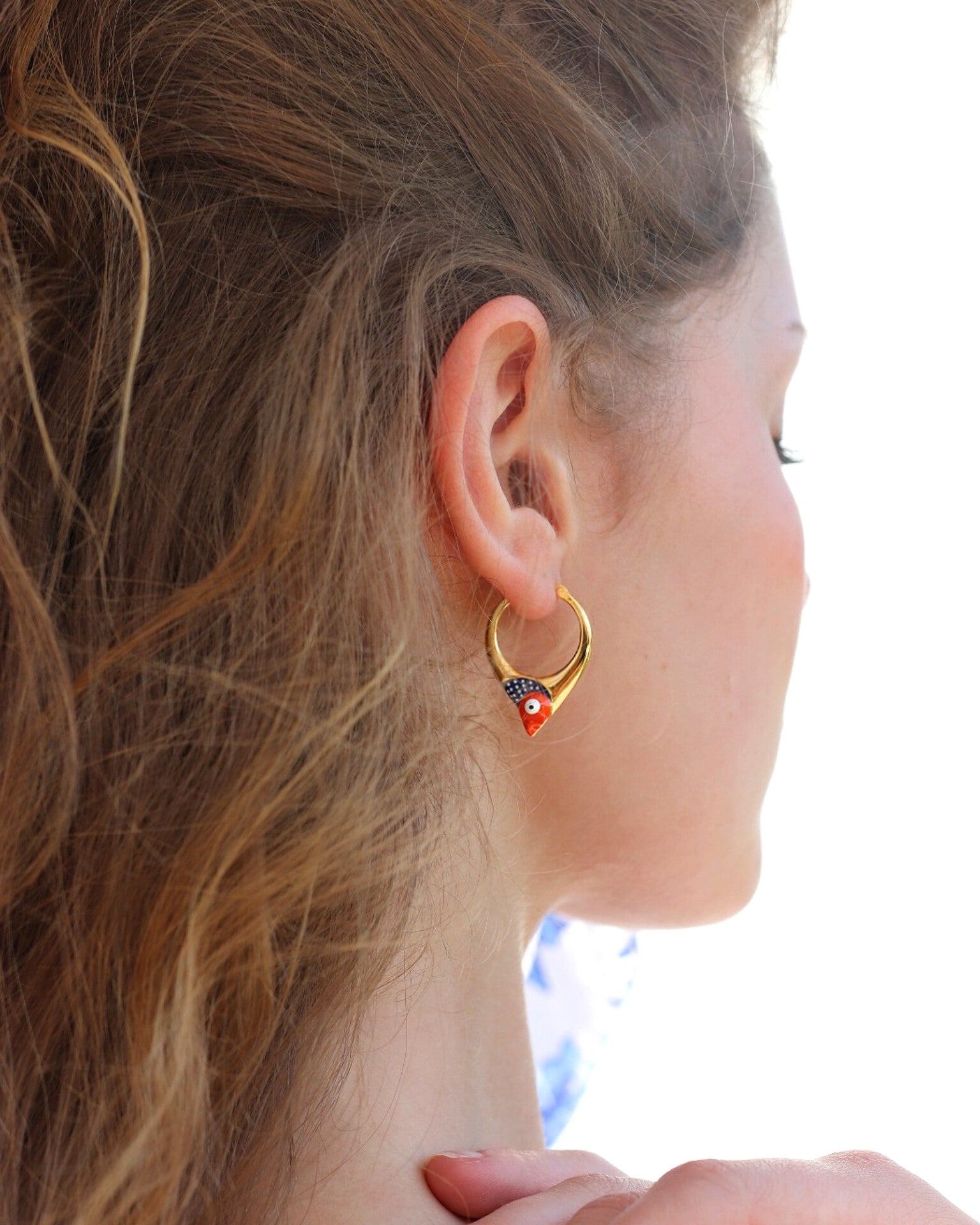 Naušnice u tipu obruča čiji je dizajn obogaćen aplikacijom emajla u bojama naše plave ribe - srdele. Naušnice su izrađene od mjedi s 18 karatnom pozlatom i ručno nanesenim završnim slojem emajlirane boje. Ne sadrže nikal i vrlo su lagane za nošenje. Zbog pozlate nije potrebno polirati. Dio su kolekcije 'Stylish heritage'
