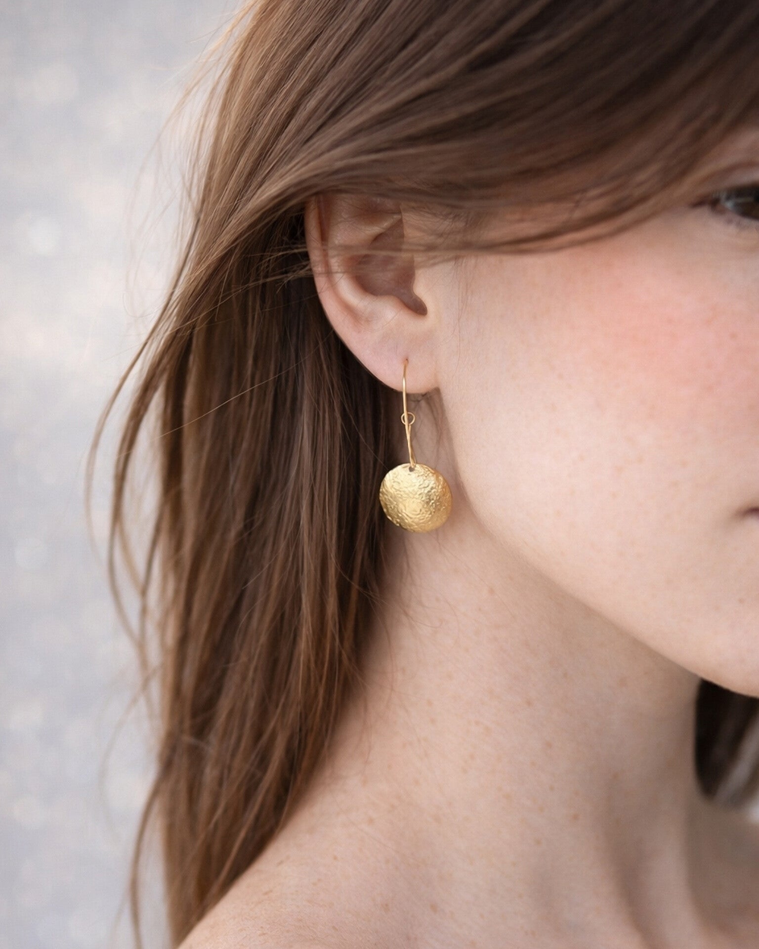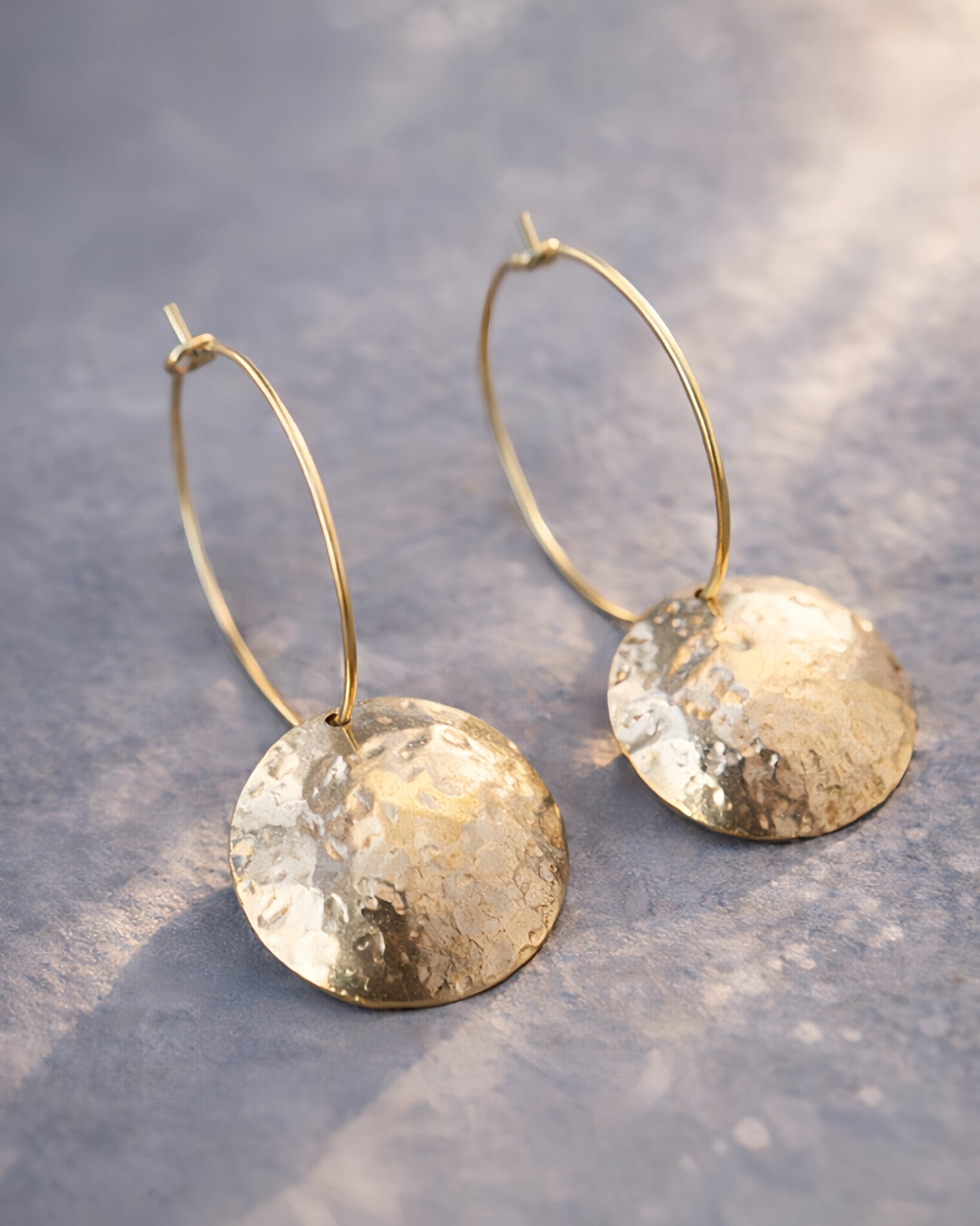 Vrlo lagane ring naušnice sa zaobljenim krugom od teksturirane mjedi. Svi metalni elementi su od mjedi, uključujući i ring.