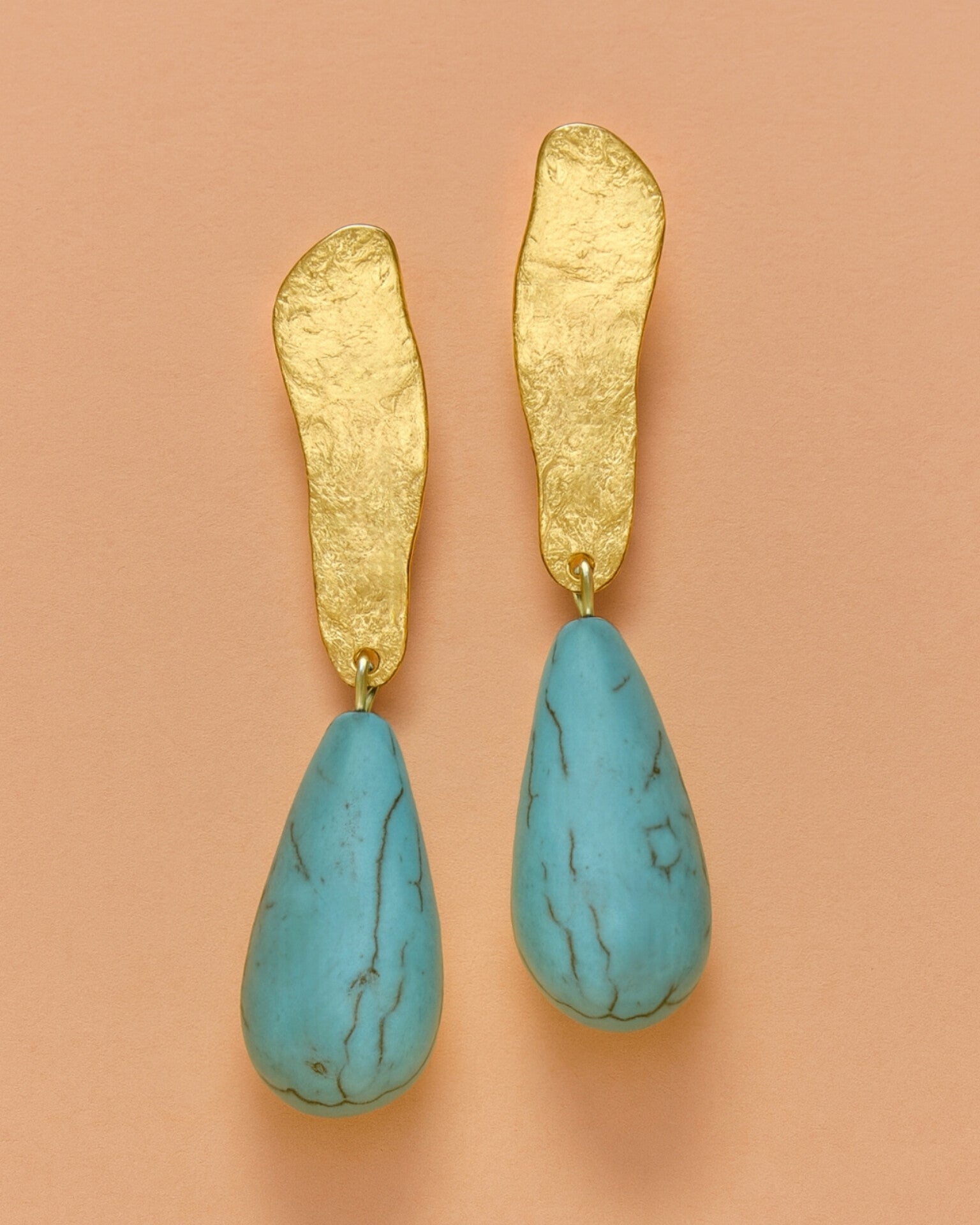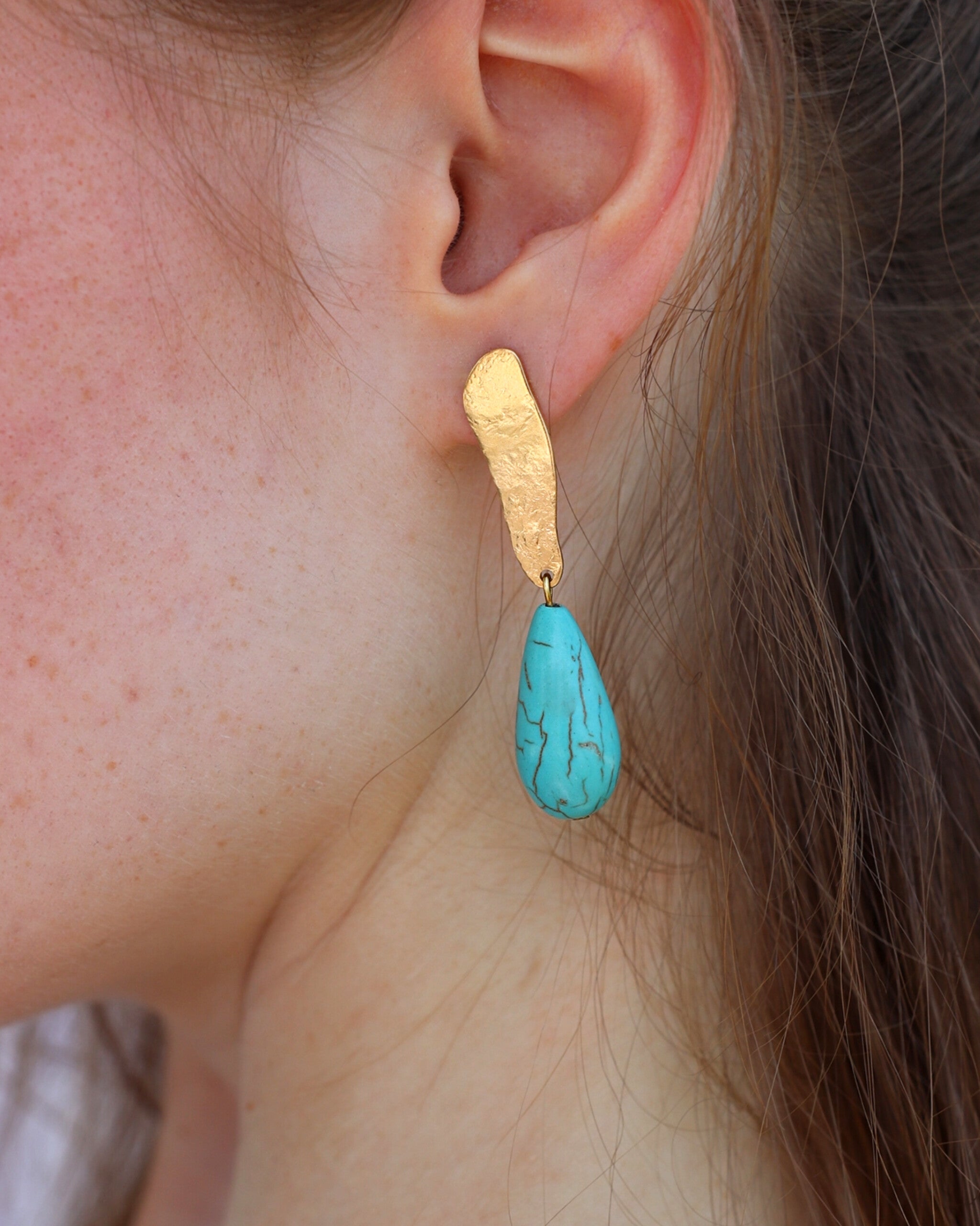 Earrings with simple lines and an irregular shape. They are made of textured brass and turquoise in the shape of a drop. All metal elements are made of brass, except for the needle, which is made of medical steel.